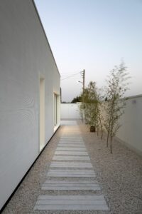 Su cubierta inclinada dota a la vivienda de un espacio singular de doble altura en el salón, dando lugar así a una habitación en la planta superior que culmina la vivienda.